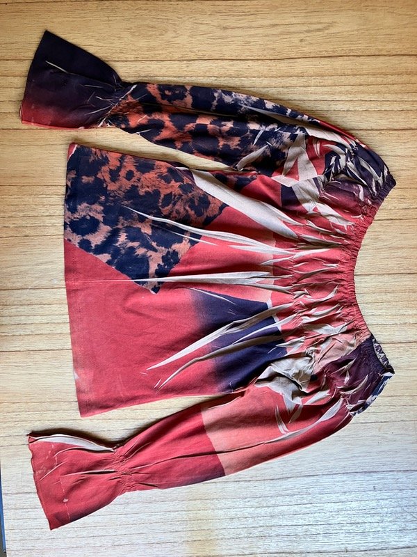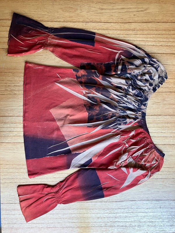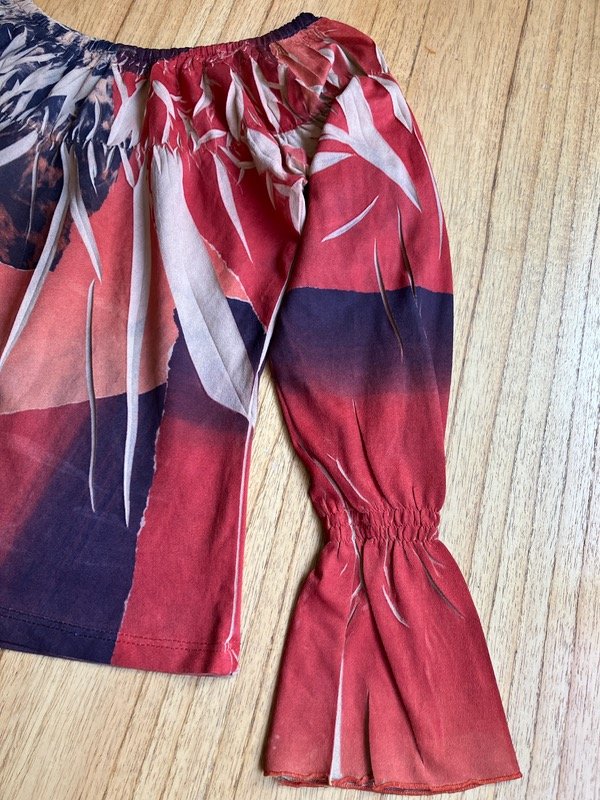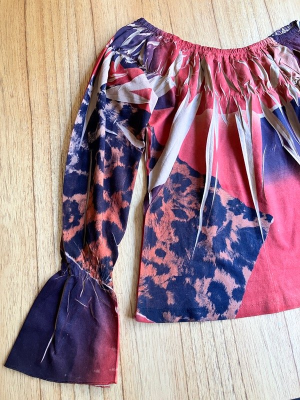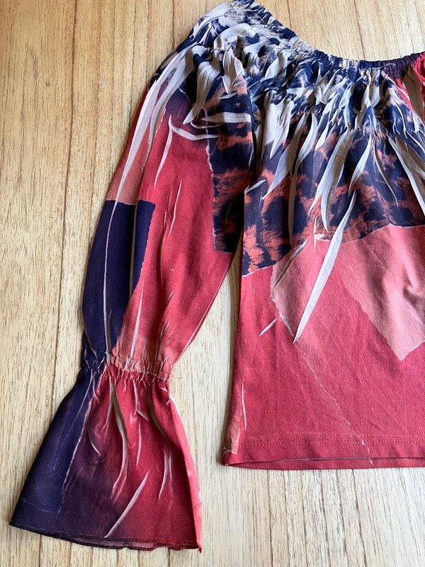 Remera elastizada con mangas acampanadas y frunce en escote y terminación de brazo