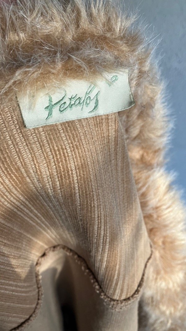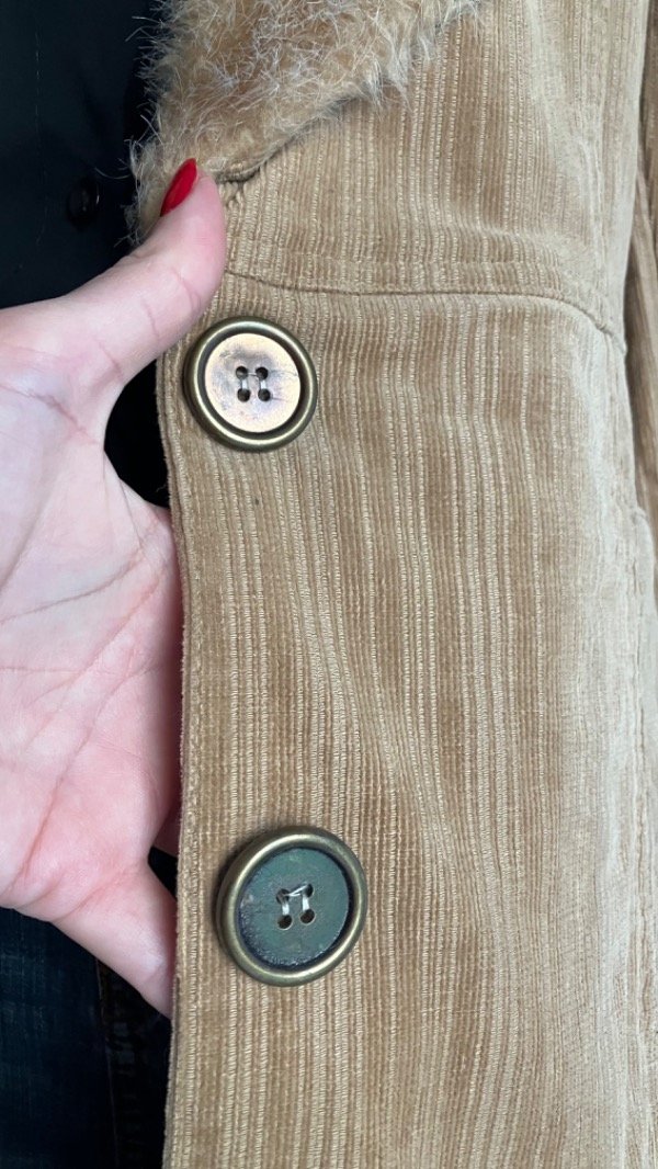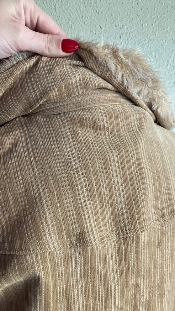 No posee etiqueta de composición pero al parecer es de algodón (corderoy) con spandex/elastano