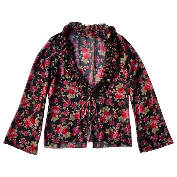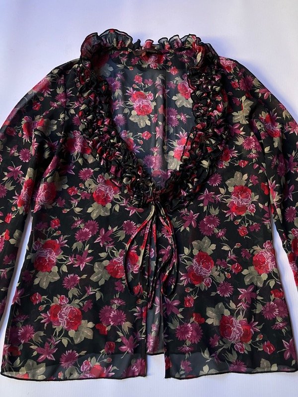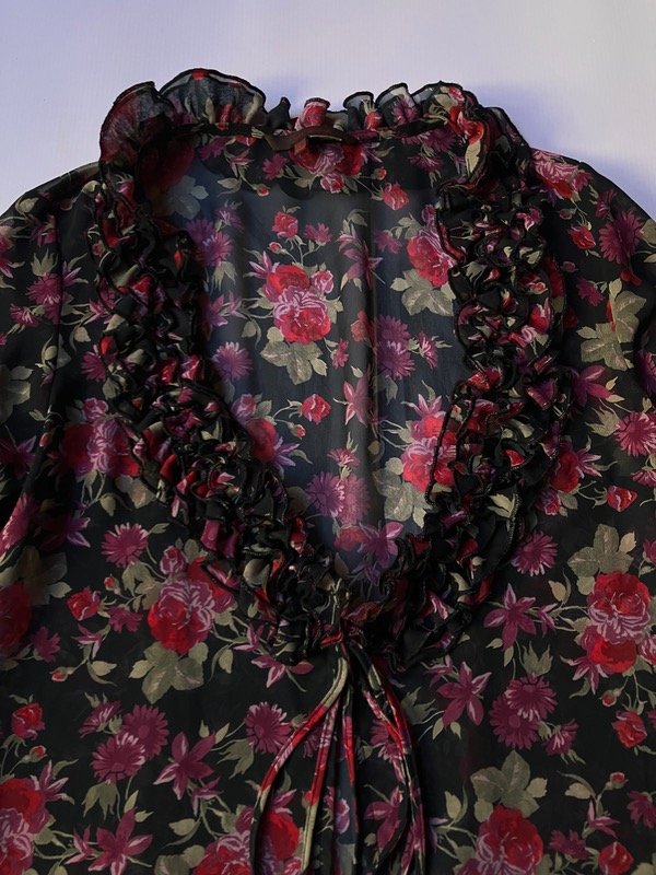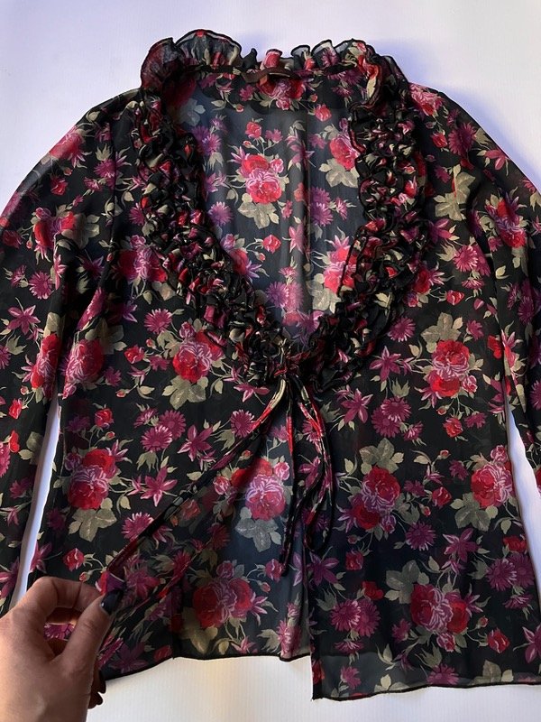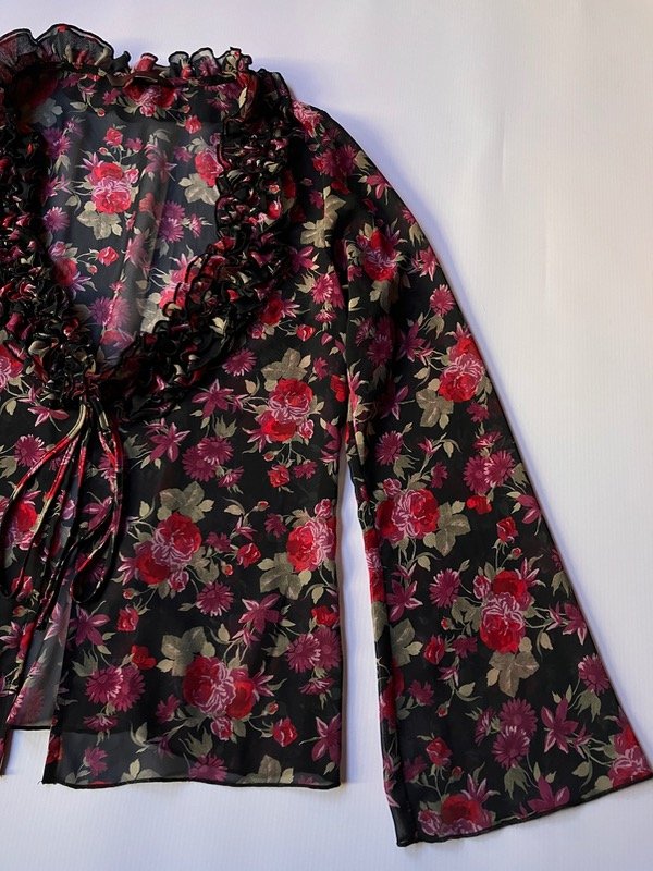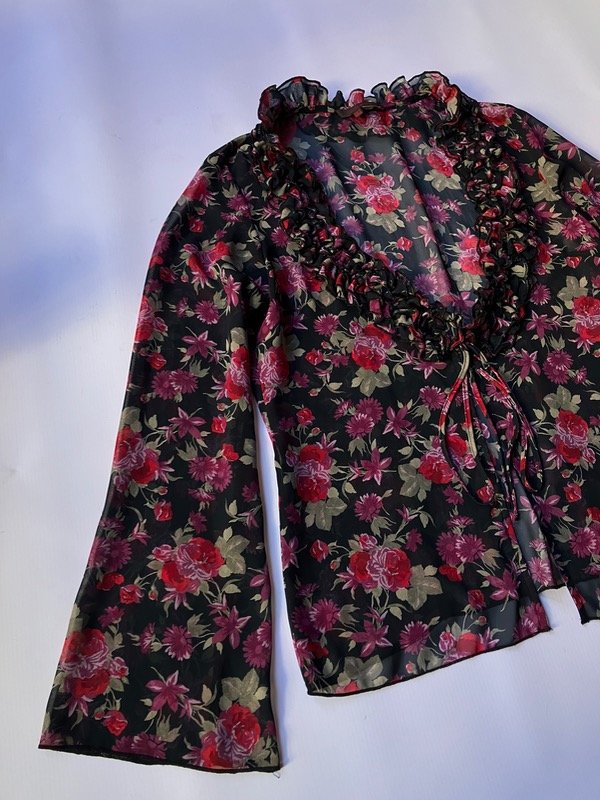 Blusa de gasa semi traslucida con mangas acampanadas volados y laso para cierre