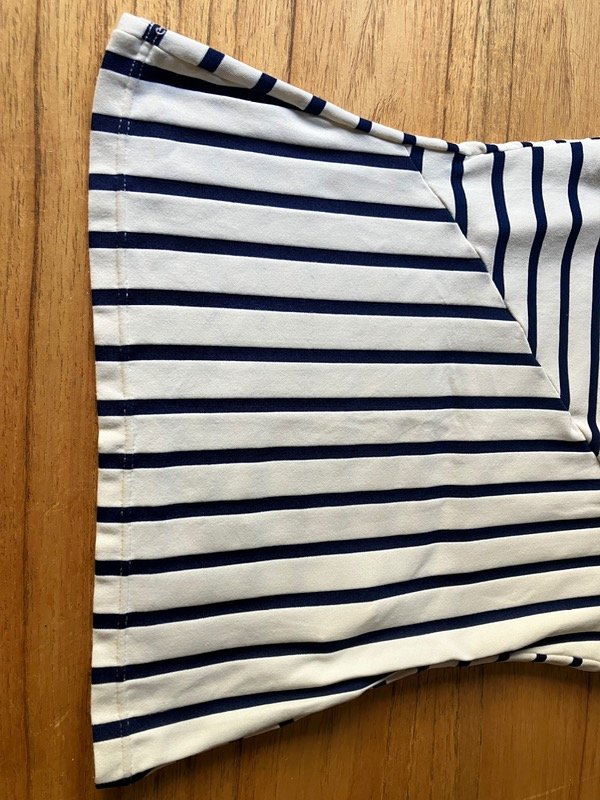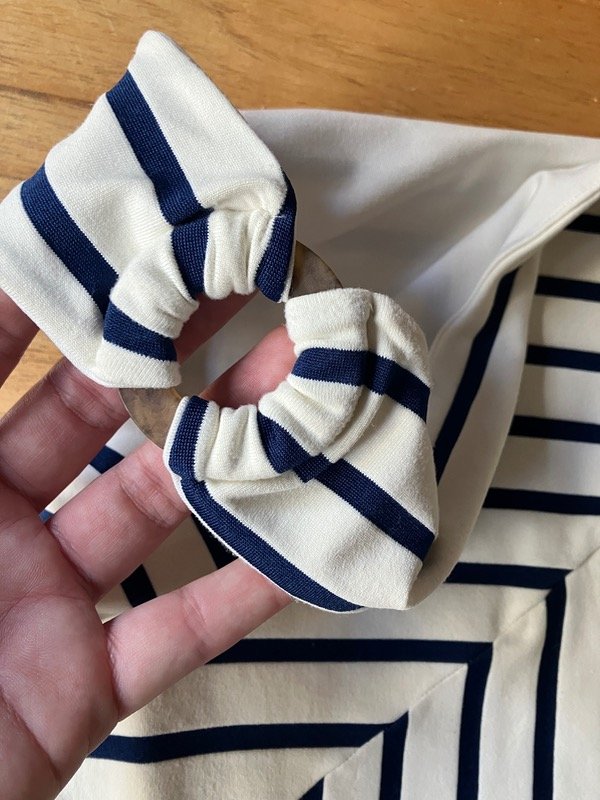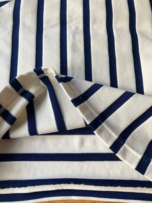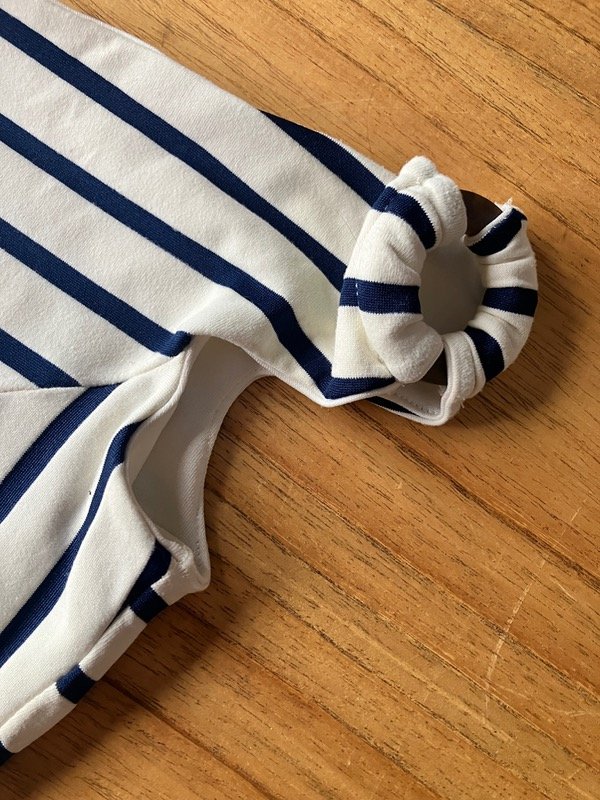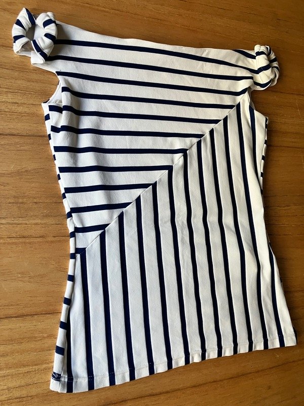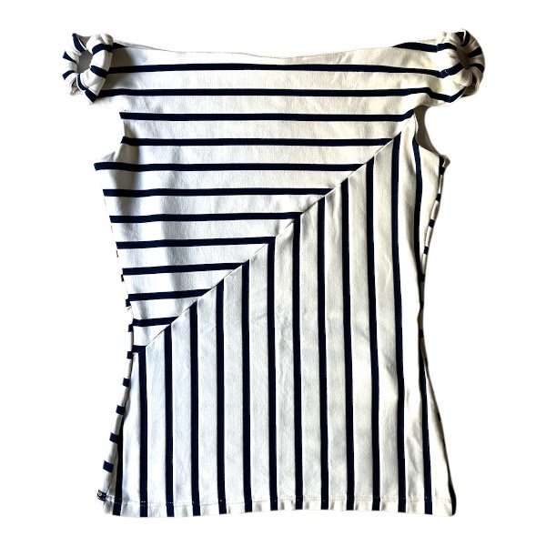 Top de lycra a los hombros color blanco con rayas azules y detalles de herrajes
